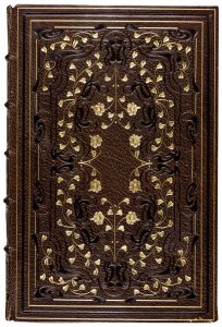Splendida legatura in stile Art Decò firmata Zaehnsdorf in marocchino marrone con elaborata e graziosa cornice floreale impressa in oro e a secco ai pitti, titoli e decori dorati ai comparti del dorso a 5 nervi.