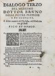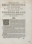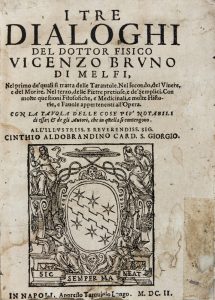 BRUNO VINCENZO, I tre dialoghi [...] nel primo de' quali si tratta delle tarantole. Nel secondo, del vivere, e del morire. Nel terzo, delle pietre pretiose... In Napoli : appresso Tarquinio Longo, 1602.