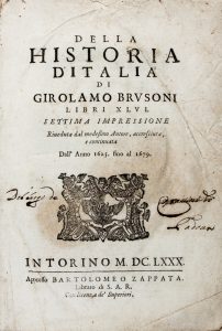 BRUSONI GIROLAMO, Della Historia d'Italia [...] libri XLVI. Settima impressione riveduta dal medesimo Autore, accresciuta, e continuata dall'anno 1625 fino al 1679. In Torino : Appresso Bartolomeo Zappata, 1680.