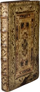 Bella legatura settecentesca in vitello con piatti riccamente decorati : placchette centrali a motivi floreali sono inquadrate da cornici concentriche di colori diversi con motivi fitomorfi alternati a piccoli ferri e delineate da duplici filetti, il tutto impresso in oro, al dorso titoli e piccoli ferri floreali sempre in oro. Risguardi in carta xilografata a tre colori.