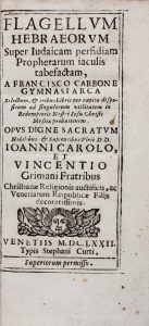 CARBONE FRANCESCO, Flagellum Hebraeorum super iudaicam perfidiam prophetarum iaculis tabefactam... Venetiis : typis Stephani Curti, 1672.