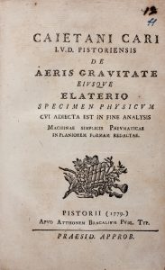 CARI GAETANO, De aeris gravitate eiusque elaterio specimen physicum.... Pistorii : Apud Atthonem Bracalium, 1779.
