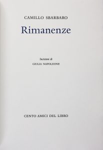 SBARBARO CAMILLO, Rimanenze. Milano : Cento Amici del Libro, [2001] (Al colophon : ) Verona : Officina Bodoni, 2001.