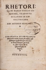 CICERO MARCUS TULLIUS, Rhetorica [...] tradotta di latino in lingua toscana per Antonio Brucioli. 1538 (Al colophon : ) In Vinega : per Batholomeo de Zanetti da Brescia, à istantia [...] di Giovanni Giolitto da Trino, 1538.