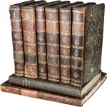 6 volumi di testo in-8° (mm 200x110) e uno di atlante (mm 260x200). Pagine XXIV, 799, [3] : VI, [2], 1006, [2] : VI, [2], 579, [1] : XXVI, 747, [1] : XXIV, 479, [1] con 4 tabelle in due carte ripiegate fuori testo : XVI, 606, [2] con 3 tavole fuori testo ripiegate in fine : 64 con 60 tavole finemente incise fuori testo, molte ripiegate.