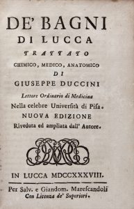 DUCCINI GIUSEPPE, De' bagni di Lucca trattato chimico, medico, anatomico... In Lucca : per Salv. e Giandom. Marescandoli, 1738.