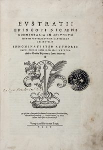 EUSTATHIUS (arcivescovo di Tessalonica), Commentaria in secundum librum posteriorum resolutiuorum Aristotelis. Venetiis : apud Hieronymum Scotum, 1542.
