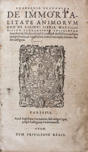 FICINO MARSILIO, Theologia Platonica de immortalitate animorum duo de viginti libris... Parisiis : apud Aegidium Gorbinum, 1559.