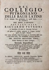 GIGLI GIROLAMO, Del Collegio Petroniano delle balie latine. In Siena : appresso Francesco Quinza Stampatore del Collegio medesimo, 1719.