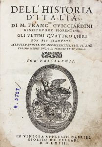 GUICCIARDINI FRANCESCO, Dell'historia d'Italia [...] gli ultimi quattro libri non piu stampati... In Vinegia : appresso Gabriel Giolito de' Ferrari, 1564.