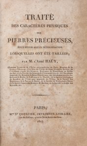 HAÜY RENÉ-JUST, Traité des caractères physiques des pierres précieuses, pour servir à leur détermination lorsqu'elles ont été taillées. Paris : Mme Ve Courcier, 1817.