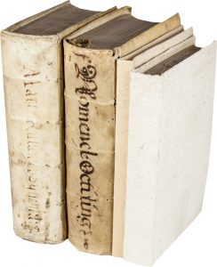 Legatura coeva in piena pergamena rigida con titoli manoscritti al dorso, lievemente lisa.