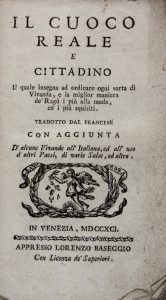 MASSIALOT FRANCOIS , Il cuoco reale e cittadino il quale insegna ad ordinare ogni sorta di vivanda… In Venezia : appresso Lorenzo Baseggio, 1791.
