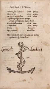 PONTANO GIOVANNI GIOVIANO, Opera. Urania sive de Stellis libri quiqu. Meteororum. Liber unus. De Hortis hesperidum. Libri duo. Lepidine sive postor ales pompae septem... (al colophon : ) Venetiis : in aedibus Aldi, et Andreae Asulani soceri, 1513.