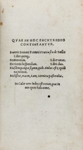 PONTANO GIOVANNI GIOVIANO, Quae in hoc enchyridio contineantur [...]. Urania seu de Stellis libri quique. Meteororum. Liber unus. De Hortis hesperidum. Libri duo. Eiusdem pompae septem... (Al colophon : ) Florentiae : ex officina Philippi de Giunta...