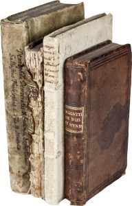Legatura settecentesca in vitello maculato con sguardie rinnovate e dorso quasi del tutto assente. (4)