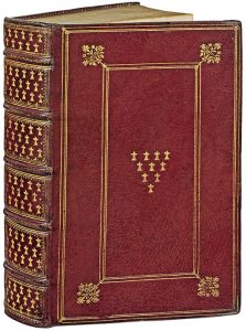 In-8 (168 x 102 mm), maroquin rouge, décor à la Du Seuil, semé d’hermines au centre des plats et dans les compartiments du dos, tranches dorées (Reliure de l’époque).