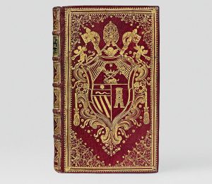 In-12 (167 x 102 mm), maroquin rouge, dos à nerfs orné de fleurons dorés, grandes armes papales sur les plats, décor aux petits fers dans les angles, tranches dorées (Reliure de l’époque).