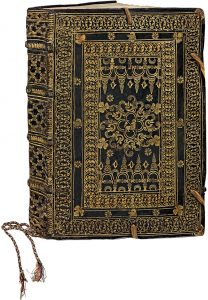 Maroquin vert à grand décor doré, dos à 4 nerfs, tranches dorées et ciselées, 4 paires de rubans orange ; tresse polychrome rouge, jaune, bleu, vert suivant la couture des cahiers et dépassant en pied de 20 cm environ (Reliure de l’époque).