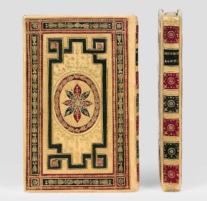 In-8 (183 x 110 mm), veau ivoire mosaïqué de maroquin rouge et vert, gardes de tabis bleu, tranches dorées (Reliure de l’époque).