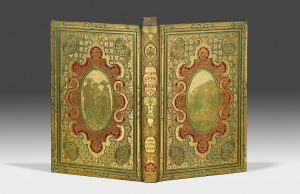 Grand in-8, veau cerise, plats entièrement couvert d'une plaque dorée avec rehauts en vert, composition ovale différente sur chaque plat, dos lisse orné de même, tranches dorées, couverture (Reliure de l'éditeur).