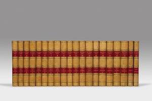 20 volumes in-8, demi-veau blond glacé, dos orné de filets et roulettes dorés et à froid, pièces de titre et de tomaison rouges, tranches mouchetées (Reliure de l'époque).