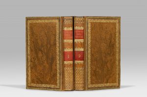 2 volumes in-8, veau raciné, dentelle dorée formée de filets et de deux roulettes dont l'une de forme festonnée et l'autre poussée sur un cadre de veau brun, dos lisse orné, pièces de titre et de tomaison rouges, tranches jaunes mouchetées de bleu (Beguin relieur).