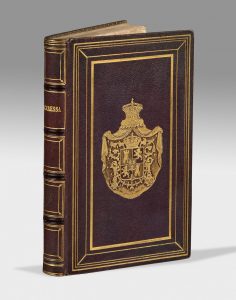 In-8, chagrin violet, encadrement de filets dorés gras et maigres, grandes armoiries dorées au centre, dos orné de filets, dentelle intérieure, doublure et gardes de moire couleur chair, tranches dorées (Reliure de l'époque).