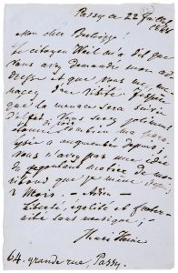 Il a su par le citoyen Weil [sic] (Alexandre Weill, poète et historien) que Berlioz avait demandé son adresse:... vous me menacez d'une visite. Il ajoute ironiquement: J'espère que la menace sera suivie d'effet, mais précise aussitôt: Vous serez joliment étonné de voir combien ma paralysie a augmenté depuis; vous n'avez pas une idée du dégoûtant métier de moribond que je mène depuis 2 mois... Et l'ironie de Heine lui dicte cette curieuse formule finale: Liberté, égalité et fraternité sans musique. Suit son adresse 64 grande rue, Passy.