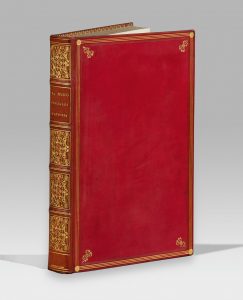 In-8, veau cerise glacé, double encadrement de triples filets dorés et à froid, fleuron doré aux angles, dos orné de caissons fleuronnés, dentelle intérieure, doublure et gardes de papier moiré ivoire, tranches dorées, étui moderne (Simier R. du Roi).