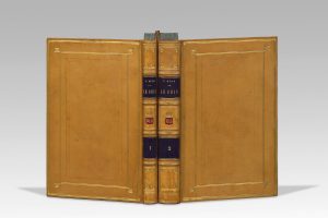 2 volumes in-8, veau blond glacé, encadrement de filets dorés et à froid, petit fer doré aux angles, dos orné, pièces de titre et de tomaison noires, chiffre HS couronné frappé sur un petit écu rouge, roulette intérieure, tranches marbrées, étui moderne (Reliure de l'époque).