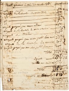 ♦3) 2 feuillets in-4 manuscrits de Juliette Drouet ayant servi pour les comptes de la «caisse commune» Hugo-Drouet (l'encre a attaqué le papier par endroits).