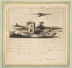 Plume et encre brune, lavis (104 x 189 mm), contrecollé sur le passe-partout sur lequel figurent 6 vers autographes signés Victor Hugo, sous marie-louise dans un cadre de bois doré.