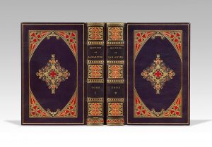 2 volumes in-8, maroquin violet à long grain, filet doré, décor doré et mosaïqué de rouge formé de quatre écoinçons à la cathédrale réunis entre eux par un filet doré, dessinant un ovale brisé, grand fleuron central de forme losangée dessiné aux petits fers, dos orné de même, grand fer mosaïqué répété dans les compartiments, roulette intérieure, doublure et gardes de papier moiré ivoire, tranches dorées, étuis modernes (Thouvenin).