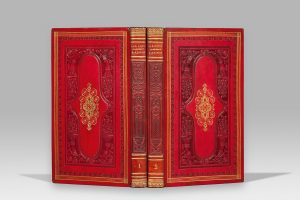 2 volumes in-8, veau cerise glacé, bordure formée d'un quadruple filet doré et d'une roulette à froid, grande plaque à froid à décor de corne d'abondance avec cartouche de forme allongée en réserve, gros fleuron doré au centre, dos lisse orné de filets dorés et d'une longue plaque à la cathédrale à froid, roulette intérieure à froid, tranches dorées, étui moderne (Cassassus).