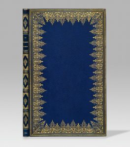 In-8, maroquin bleu, triple filet large dentelle droite accompagnée de filets, dos orné, dentelle intérieure dorée, tranches dorées, couverture (Reliure de l'époque).