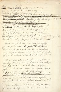 ♦ Octave, [1831]. 3 pages in-4 sur un double feuillet à en-tête du Ministère de la Guerre, présentant une dizaine de ratures ou de corrections: Ni ce moine rêveur, ni ce vieux charlatan / N'ont deviné pourquoi Mariette est mourante / Elle est frappée au coeur, la belle indifférente. Poème publié dans la Revue de Paris du 24 avril 1831.