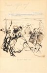 Une dame en costume du XVIIIe siècle se fait chausser par sa femme de chambre, entourée de trois personnages, dont deux hommes en perruque. On devine un lit d'alcôve au fond de la scène. Tracé d'une plume vigoureuse, ce dessin illustre joliment le badinage des comédies proverbiales de Musset.