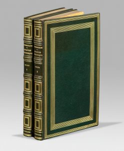 2 volumes in-8, maroquin vert foncé à long grain, double encadrement de multiples filets dorés, dos orné avec caissons dessinés aux filets dorés, encadrement intérieur de filets, doublure et gardes de soie moirée orange, tranches dorées sur témoins, couverture et dos, étui moderne (Mercier sr. de Cuzin).