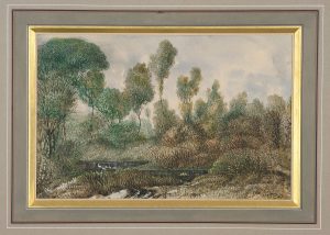 SAND (George) - Paysage boisé avec bras d'eau. Aquarelle originale avec rehauts de gouache, technique de la dendrite, signée et datée en bas au milieu : G. Sand 1875.