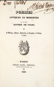 Chaque ouvrage porte sur le titre un envoi autographe de Vigny à Madame Émile Deschamps. Le premier: Don filial. Alfred de Vigny ; et le second :