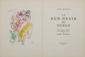 [CHAGALL (Marc)] - ÉLUARD (Paul).. Le Dur désir de durer.. Paris : Arnold-Bordas, [1946]. — In-folio, 385 x 285 : 59 pp., (6 ff.), couverture imprimée. En feuilles, couverture rempliée.. Édition originale illustrée de 25 dessins de Marc...