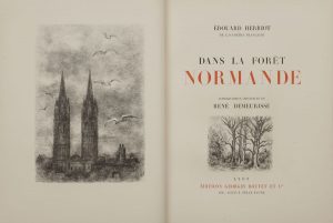 [DEMEURISSE (René)] - HERRIOT (Édouard).. Dans la forêt normande.. Lyon : Georges Bouvet et Cie, 1947. — In-folio, 329 x 250 : 172 pp., (3 ff. dernier blanc), couverture illustrée. Maroquin vert janséniste, dos à nerfs, encadrement de...