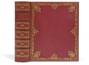 double filet doré en encadrement sur les plats, dos à nerfs orné, encadrement de maroquin vieux rose à l’intérieur, orné d’une dentelle dorée, doublures et gardes de soie moirée grise, tranches dorées sur témoins, couverture et dos conservés, chemise à dos et bandes à recouvrement de maroquin rose, étui bordé (Alix 1969).. Belle édition tirée à 1034 exemplaires, illustrée de 19 compositions en couleurs de William FEL dont une sur la couverture et 18 hors texte.. Un des 25 exemplaires sur vélin de Hollande, second papier après 19 sur Madagascar, enrichis d’une pointe sèche spéciale tirée sur japon impérial supernacré et d’une suite en noir des illustrations.. Exemplaire unique, superbement relié par Alix, enrichi de 4 reproductions de gravures libres du XVIIIe siècle, des 12 eaux-fortes en couleurs avec remarques de TIMAR pour l’édition Briffaut des années 20 ou 30, d’une suite en noir avec remarques de ces eaux-fortes, et des 26 compositions en couleurs de Henriette BELLAIR pour l’édition Briffaut des années 40.. Provenance : docteur Aubin, avec ex-libris en lettres dorées sur l’encadrement de la doublure.