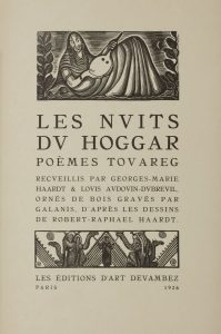 recouverts d’un papier travaillé à la main à motifs de coulures dans les tons bruns, dos lisse, tête dorée, non rogné, couverture et dos conservés, rhodoïd (Dominique Comolli).. Très belle édition tirée à 500 exemplaires, réunissant des poèmes touareg recueillis par Georges-Marie Haardt qui avait été le chef des expéditions automobiles Citroën en Afrique et en Asie, et l’explorateur Louis Audouin-Dubreuil, chef-adjoint du raid Citroën Touggourt-Tombouctou et des expéditions Citroën en Centre-Afrique et en Centre-Asie.. L’édition est illustrée de nombreux bois gravés par Démétrius GALANIS (1879-1966), dont un en frontispice et 6 à pleine page, d’après les dessins de Robert-Raphael Haardt, sous la direction d’Édouard Chimot.. Un des 400 exemplaires sur vélin d’Arches, très bien relié par Dominique Comolli.