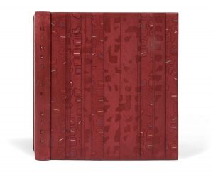 et de taches rappelant celles des peaux de girafes, 5 bandes de veau rouge cramoisi ornées des mêmes motifs mais légèrement en relief et décorées de courts filets multicolores collées sur chacun des plats ; dos lisse, doublures de veau rouge cramoisi avec empreinte de bandes parallèles verticales, gardes de maroquin bordeaux, non rogné, couverture et dos conservés, étui-boîte (Florent Rousseau 1997).. Saphire-Cramer, N°42.. Édition originale parue dans la collection « Miroir des poètes », illustrée de 4 aquatintes originales en couleurs à pleine page d’André MASSON (1896-1987).. Tirage à 147 exemplaires signés par l’artiste. La justification n’en mentionne que 130 mais il y eut également, selon Saphire et Cramer, 10 exemplaires de Chapelle sur Rives et 7 exemplaires sur différents papiers.. Un des 140 exemplaires sur vélin de Rives, celui-ci, portant le N°1, étant l’un des 115 numérotés de 1 à 115. Entièrement monté sur onglets, il est recouvert d’une très belle reliure originale de Florent Rousseau. La double couverture sur japon y est bien présente.. Provenance : ex-libris avec les initiales AL.