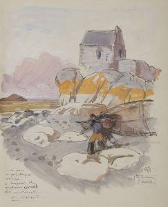 diagonale s’entrecroisant, et de 9 coquillages dorés situés au niveau des croisements des filets, dos à 3 nerfs, doublures et gardes de chagrin havane, tête dorée, non rogné, couverture et dos conservés, étui (D. Comolli).. Édition des plus réussies illustrée de 82 compositions de Mathurin MÉHEUT (1882-1958), dont un frontispice, 10 lettrines, 67 compositions dans le texte et 4 illustrations à pleine page.. Tirage à 1000 exemplaires ; celui-ci est l’un des 600 numérotés sur vélin du. Marais et plus spécifiquement l’un des 440 sur ce papier numérotés de 161 à 600.. Précieux exemplaire relié par Dominique Comolli, enrichi d’une belle et grande aquarelle originale signée de Mathurin Méheut, dédicacée au couple Comolli.. Provenance : Dominique et Yvan Comolli, avec ex-libris.