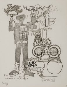 entièrement conçue par l’artiste Gabriel PARIS et par Raymond Queneau de 1963 à 1965, tirée à 60 exemplaires sur vélin d’Arches et illustrée de 8 eaux-fortes originales hors texte de Gabriel PARIS.. Un des 45 exemplaires signés et numérotés par l’artiste de 11 à 55.