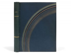illustrée. Maroquin bleu turquoise, premier plat traversé par un décor de 11 filets courbes dorés, d’un listel de maroquin vert et d’un autre de maroquin bleu nuit sur lequel a été collée une bande de maroquin beige ; dos lisse, encadrement de maroquin bleu nuit orné de filets à froid à l’intérieur, doublures et gardes de soie moirée bleue, tranches dorées sur témoins, couverture et dos conservés, étui (Creuzevault).. Première édition illustrée, comprenant 66 compositions en couleurs d’André SURÉDA (1872-1930), dont 9 hors texte, interprétées en gravures sur bois par François-Louis SCHMIED (1873-1941) qui a lui-même composé la couverture, les ornements ainsi que les 17 très belles lettrines, et exécuté l’impression sur ses presses à bras.. Il s’agit certainement du plus beau des livres illustrés par André Suréda, l’un des meilleurs peintres orientalistes de sa génération. . L’édition ne fut tirée qu’à 152 exemplaires sur japon impérial, celui-ci étant l’un des 120 imprimés au nom des membres de la Société “Le Cercle Lyonnais du Livre”, ici pour M. Georges E. Lang.. Très bel exemplaire en pleine reliure de Creuzevault. Dos légèrement passé.. Provenances : Georges E. Lang. - Docteur Georges Marchal, avec ex-libris. - Dominique et Yvan Comolli, avec ex-libris.
