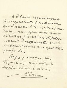 Exprimez-lui toutes mes excuses [...] Je lui suis reconnaissant de ses excellentes intentions en ce qui concerne l'Académie Française, mais après mûre considération j'ai renoncé définitivement à me présenter. J'ai le sentiment d'une incompatibilité profonde»...